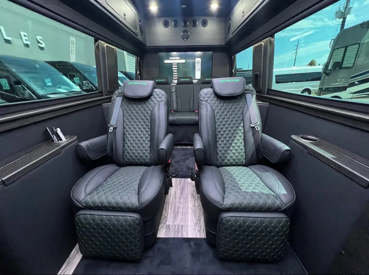 Relax in plush leather seating with premium finishes, enjoy advanced climate control, and stay online anywhere with Starlink Wi-Fi. Complimentary refreshments and AirPlay-enabled TVs make your travel feel effortless and refined.